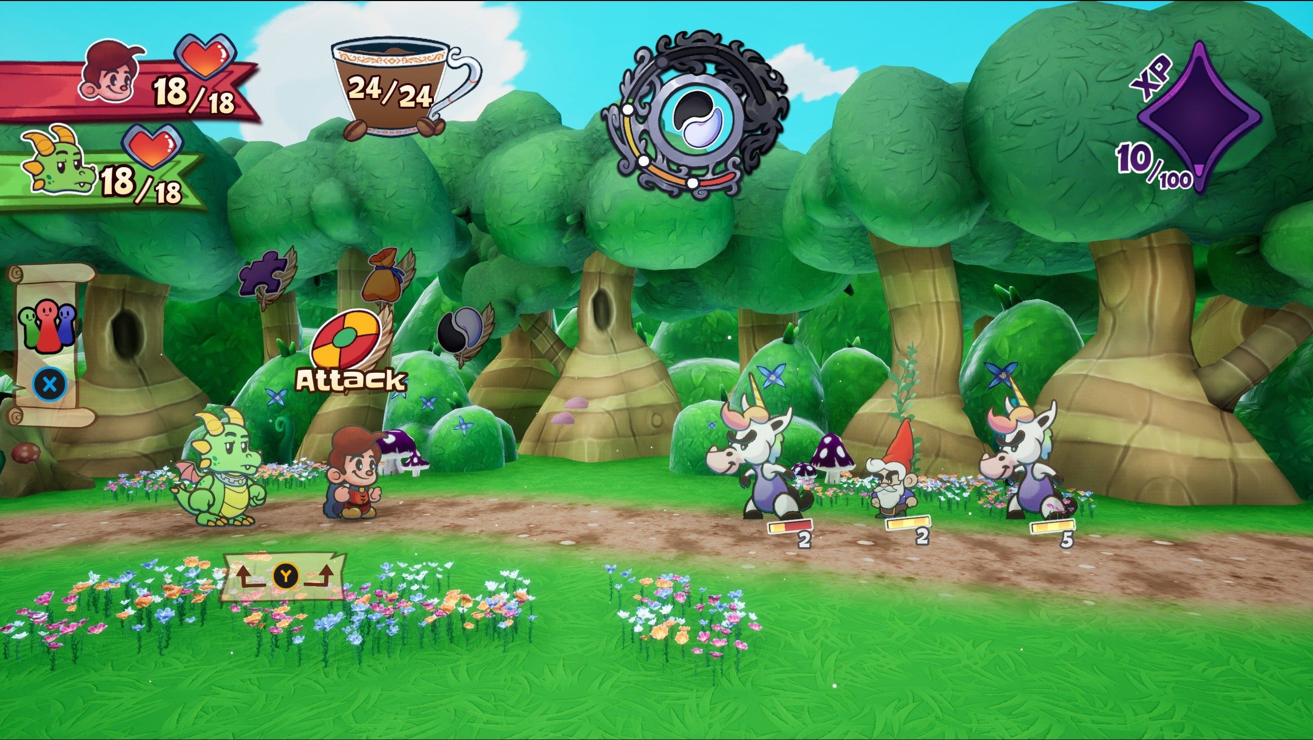 Escape from Ever After proudly wears its influences on its sleeve. Those intimately familiar with Paper Mario: The Thousand-Year Door will feel right at home, as many design elements seem directly lifted from it. Featuring the iconic art style, the core gameplay loop has you traversing a variety of worlds, each offering a mix of combat, puzzles, and exploration. Combat follows a turn-based structure with active elements that require you to time button presses or directional inputs to deal maximum damage. Likewise, when enemies attack, you can time a button press in sync with their animation to reduce or even negate incoming damage. It is a very familiar system for anyone who has played Nintendo’s Mario RPGs.